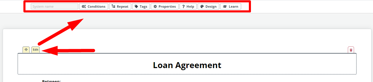 When a Title is placed unto the Editor Canvas, it is possible to type text into the field, without a Text Element. Titles have a single menu item (Edit) and a navigational tool that appears when the cursor hovers over them. Clicking the Edit button, allows you to maintain focus on the Title, “freezing” it for editing. Doing this will change the top menu view, making visible tabs for: Conditions, Repeat, Tags, Proprieties, and Design.