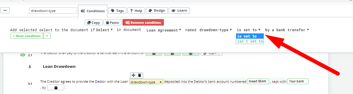 As we saw in the Educational Course on Document Automation Task 5, the Select Element Condition can be used to add certain text to the agreement contingent on a particular selection.